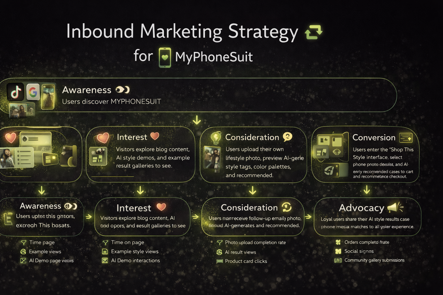 The MyPhoneSuit AI journey is more than a traditional conversion funnel—it is a style discovery experience powered by artificial intelligence. We attract users through inspiration and curiosity, engage them through photo-based style analysis, and convert them through personalized product recommendations. By turning real-life moments into fashion-driven mobile accessories, every customer becomes part of our evolving brand story.